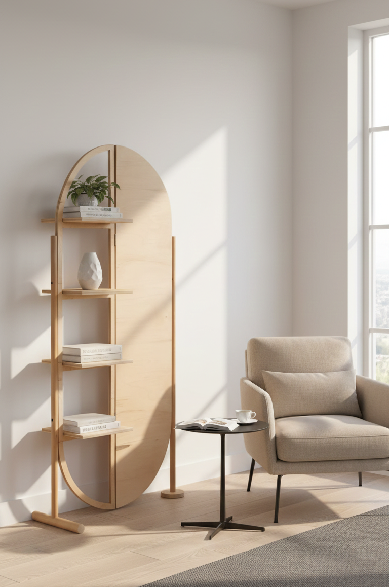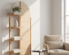 Hình dáng nghệ thuật: Kệ có khung hình vòm cung (oval) độc đáo, chia làm hai nửa đối xứng: một bên là hệ kệ mở thanh thoát và một bên là tấm gỗ phẳng tạo điểm nhấn thị giác mạnh mẽ.